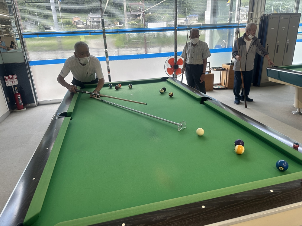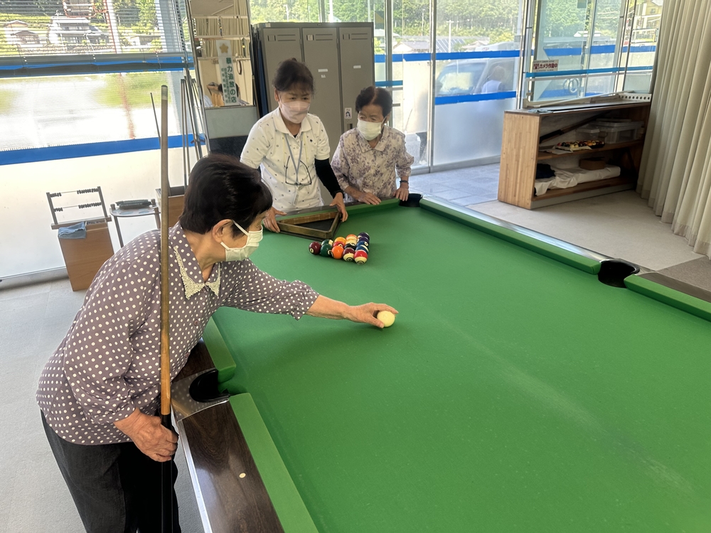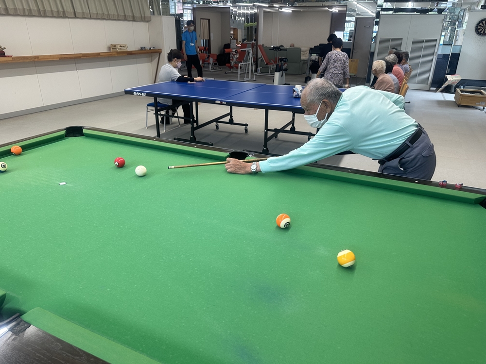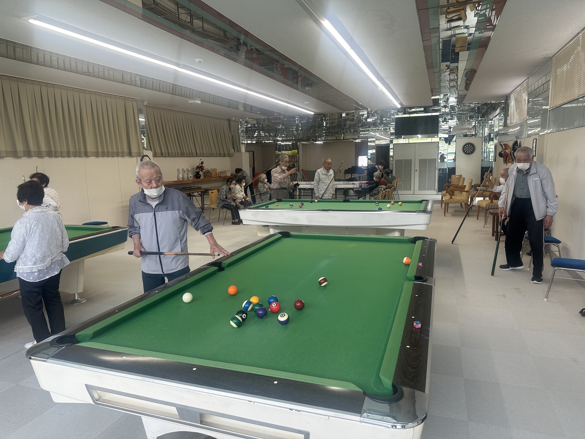 通所型サービスAとは、事業所内でミニデイサービスや運動・レクリエーション等を行うサービスです。高齢者の閉じこもり予防や自立支援に資する通所事業としてミニデイサービスや運動、レクリエーション活動を行います。ひまわりではビリヤードやカラオケ、トレーニングマシン、麻雀などたくさんの遊びの場をご用意しています。