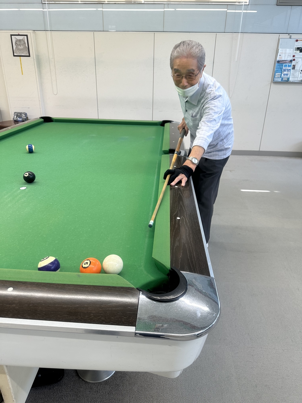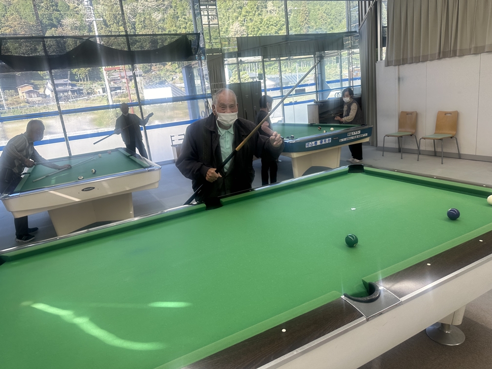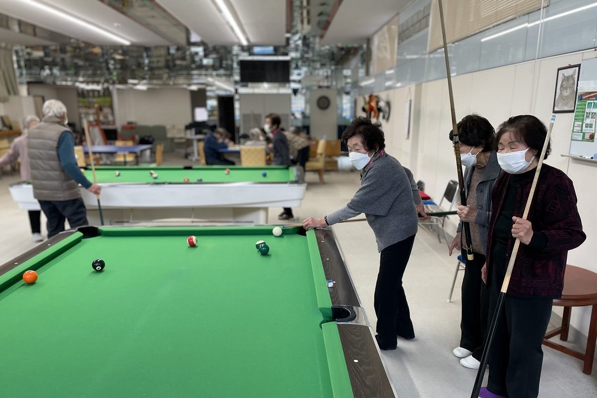 通所型サービスAとは、事業所内でミニデイサービスや運動・レクリエーション等を行うサービスです。高齢者の閉じこもり予防や自立支援に資する通所事業としてミニデイサービスや運動、レクリエーション活動を行います。ひまわりではビリヤードやカラオケ、トレーニングマシン、麻雀などたくさんの遊びの場をご用意しています。